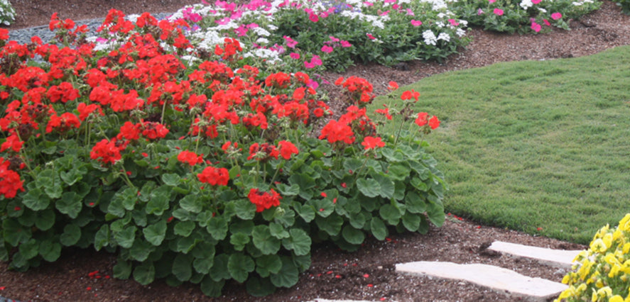 Geraniums (Pelargonium spp.) is known for bright, showy flowers and attractive, rounded leaves. The flowers bloom in clusters atop sturdy stems and come in a wide range of colors, including red, pink, white, orange, and purple. Though geraniums can be perennial in warm climates (zones 10-11), they are treated as annuals in most regions since they do not survive freezing temperatures.